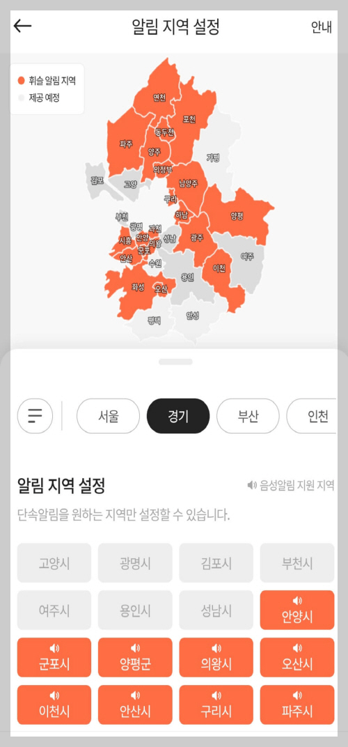 본인이 알람을 받고자 하는 지역을 선택해서 등록을 해주시면 됩니다.