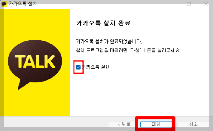 설치가 끝났으면 이제 실행에 체크하시면 이제 카카오톡이 실행이 됩니다.